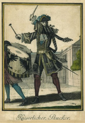 Der Stich zeigt einen „Kaiserlichen Pauker“ in prächtiger Livree in Ausübung seiner Tätigkeit vor stilisierter urbaner oder höfischer Architektur. Zwei Kesselpauken mit Schmuckbehängen, die den Kaiserlichen Doppeladler zeigen, werden dem Musiker von einem Paukerjungen vorangetragen. Der Pauker selbst zeigt in Gewand und Habitus allerhöchste repräsentative Würde. Der Degen kennzeichnet ihn als Person von „wehrhaftem“ Stand. Federn, Ärmelrüschen, Goldbordüren und goldene Knöpfe zieren seine Kleidung, die von feinster Machart ist. Anders als gewöhnliche Livreen, die als Kleidung für Bedienstete adeliger Geschlechter Macht und Ansehen des jeweiligen Herrenhauses zu repräsentieren hatten, trugen im gesamten Heiligen Römischen Reich Deutscher Nation die Pauker (und Trompeter) an ihren Uniformen sogenannte „Flügel“. Sie sind hier als wehende Bänder dargestellt, die für gewöhnlich in Schulterhöhe befestigt waren und durch den Gürtel zum Körper gerafft wurden.